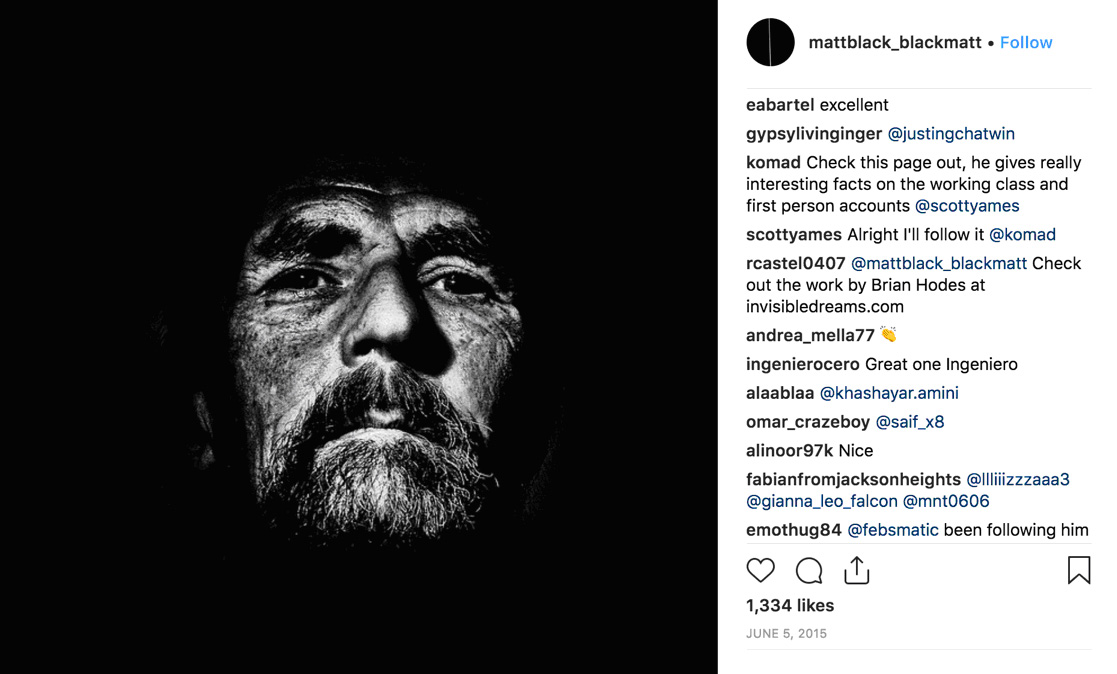 Matt Black. Using Instagram as the primary platform for their investigative material, Mermelstein and Black operate on different scales and in different territories; both are methodical chroniclers of America today. Black documents hands harvesting crops for a few bucks, Mermelstein zooms in on screens held tight by hands with painted nails.